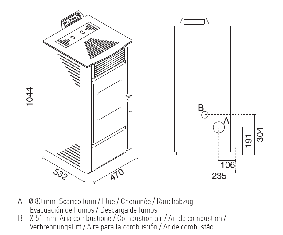 Technische Eigenschaften des belüfteten Pelletofens – EVA CALOR Paola 13,5 kW